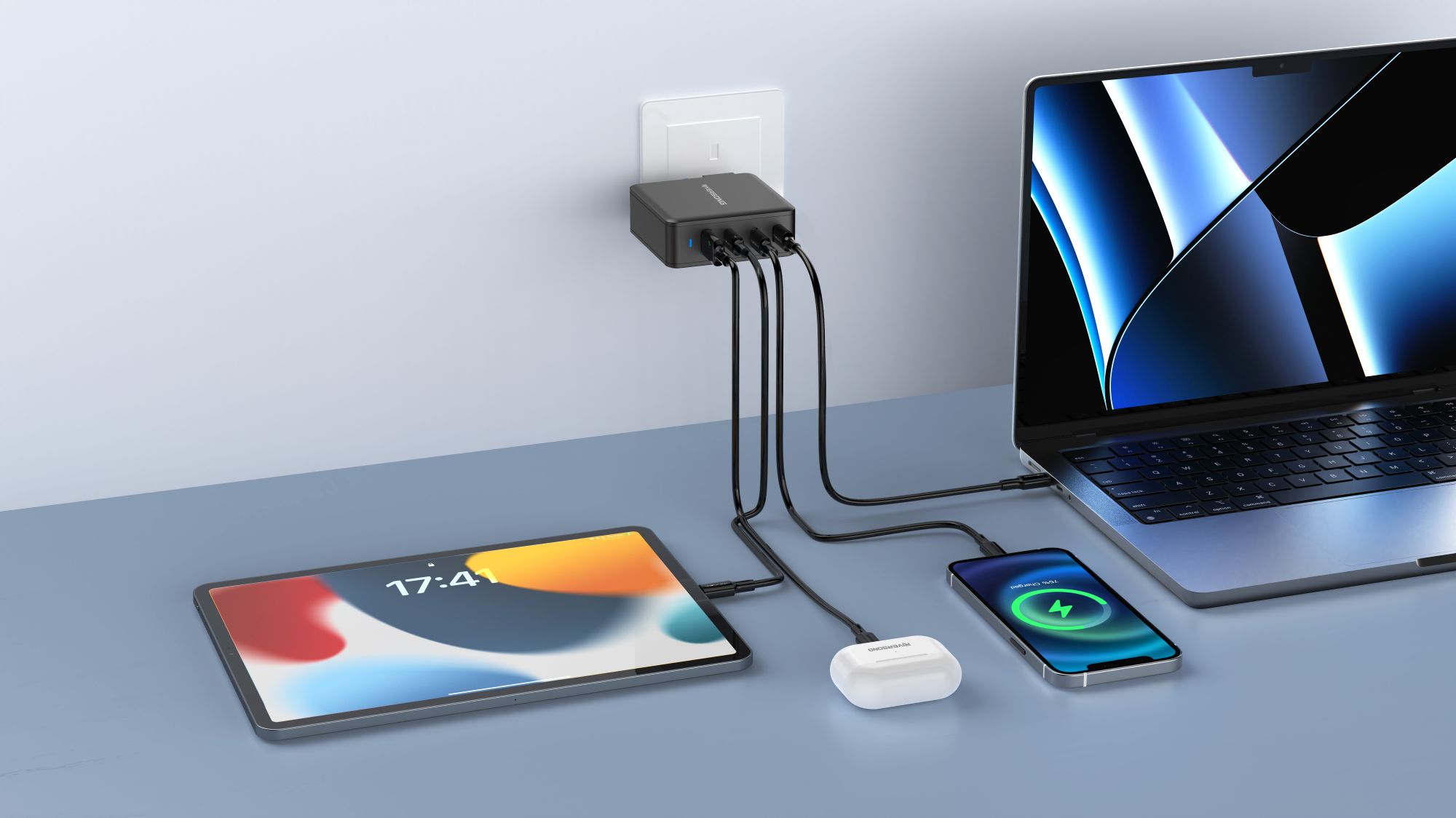 With Three Type-C ports and a USB-A ports, allowing for simultaneous charging of your phone, tablet and laptop conveniently.