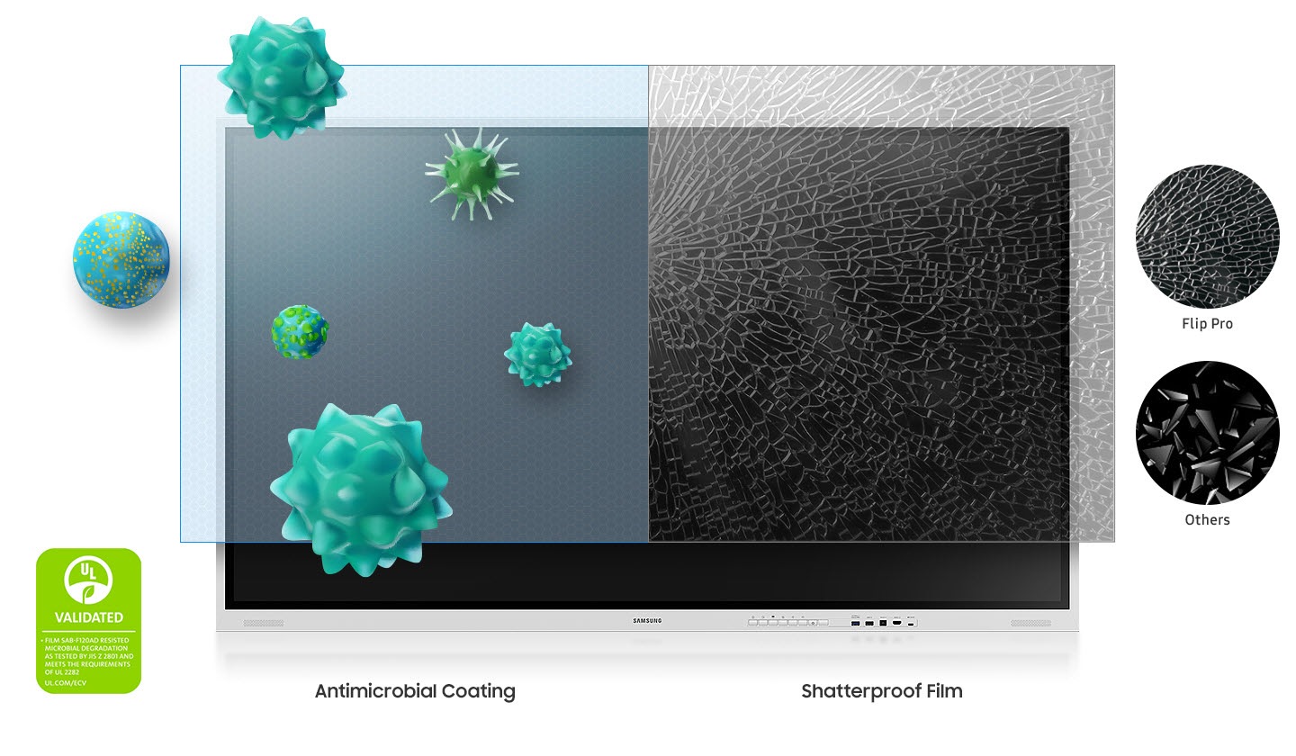 Samsung Flip Pro delivers peace of mind with a built-in Antimicrobial Coating which inhibits microbial growth.